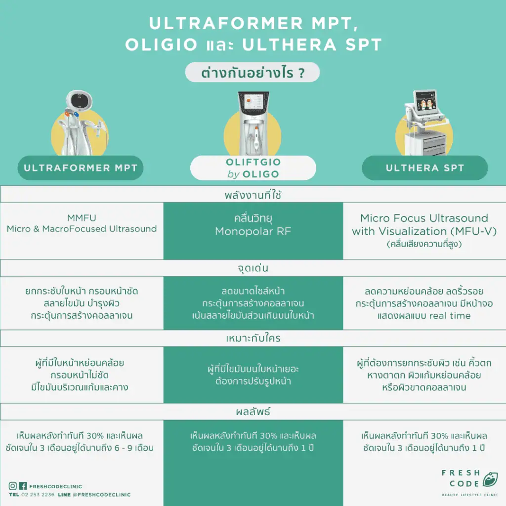 การยกกระชับผิวแบบไม่ต้องผ่าตัดกลายเป็นทางเลือกยอดฮิตในยุคนี้ เพราะเห็นผลไว ไม่ต้องพักฟื้น และปลอดภัย ซึ่งในปัจจุบันมีเครื่องมือให้เลือกหลายแบบ เช่น Oligio, Ulthera และ Ultraformer MPT โดยแต่ละตัวก็มีจุดเด่นเฉพาะตัว