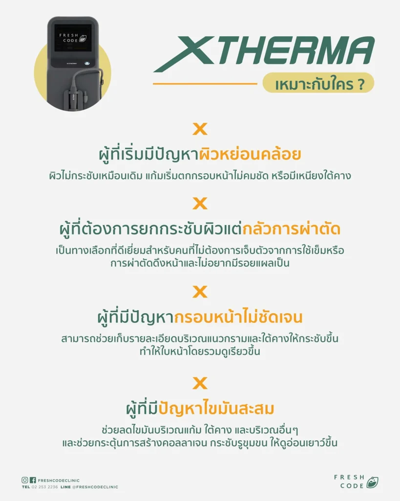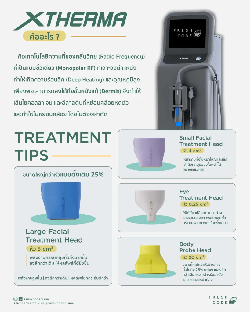 XTHERMA (เท็นเธอร์มา) คือเครื่องยกกระชับผิวด้วยเทคโนโลยี Monopolar RF ที่ให้พลังงานความร้อนลึกระดับ 6.78 MHz / 400W เพื่อกระตุ้นการสร้างคอลลาเจนในชั้นหนังแท้แบบ ไม่ต้องผ่าตัด ไม่ทำลายผิว ไม่มีแผล และไม่ต้องพักฟื้น.